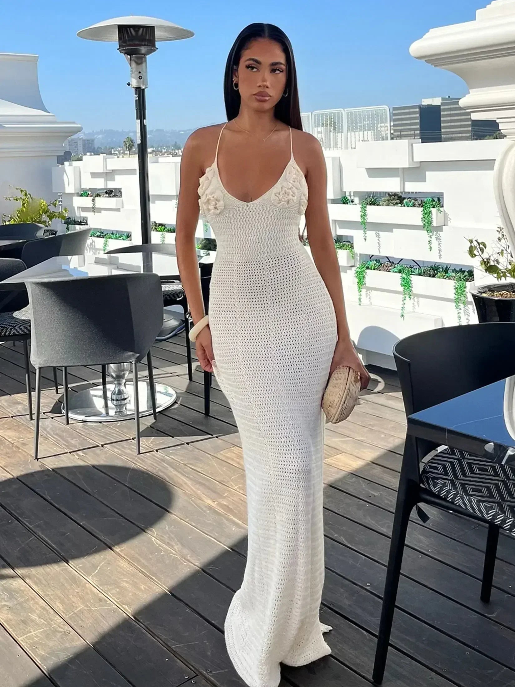 Stralend wit, elegant gevormd en perfect voor warme dagen. ALVA is een stijlvolle maxi jurk met spaghetti bandjes, een vrouwelijke V-hals en bloemenapplicaties die zorgen voor een romantische touch. Ideaal voor een zomerse dag op vakantie of een sfeervol diner bij zonsondergang.