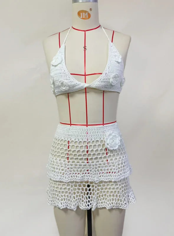 De set bestaat uit een halter bikinitop met 3D bloemenapplicaties en een bijpassende, gevouwen minirok die je silhouet elegant benadrukt. De opengewerkte stof zorgt voor een luchtige feel, terwijl de stretchy pasvorm comfort garandeert – zelfs op de warmste dagen.