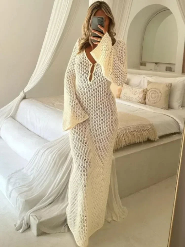Elegantie en nonchalance komen samen in deze strandjurk van fijn gehaakt materiaal. LYSSA is ontworpen voor zonnige momenten en eindeloze vakantiedagen. De V-hals, backless look en maxi lengte creëren een ontspannen maar verfijnde uitstraling – perfect als stijlvolle cover-up bij het zwembad of tijdens een strandwandeling.